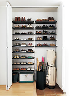 もう1つのポイントは収納です。収納の基本は、しまう物によってふさわしい場所を用意すること。例えばご主人の趣味がゴルフでしたら、玄関にゴルフバッグを置けるスペースをつくっておくと便利です。趣味の道具のしまい場所は、意外と忘れがちになるもの。しっかり確保しておきましょう。家族の服をたくさんしまえる収納やキッチンの下に収納とか子供部屋の屋根裏のスペースを利用した広い収納部屋とかもいいですよ。 |